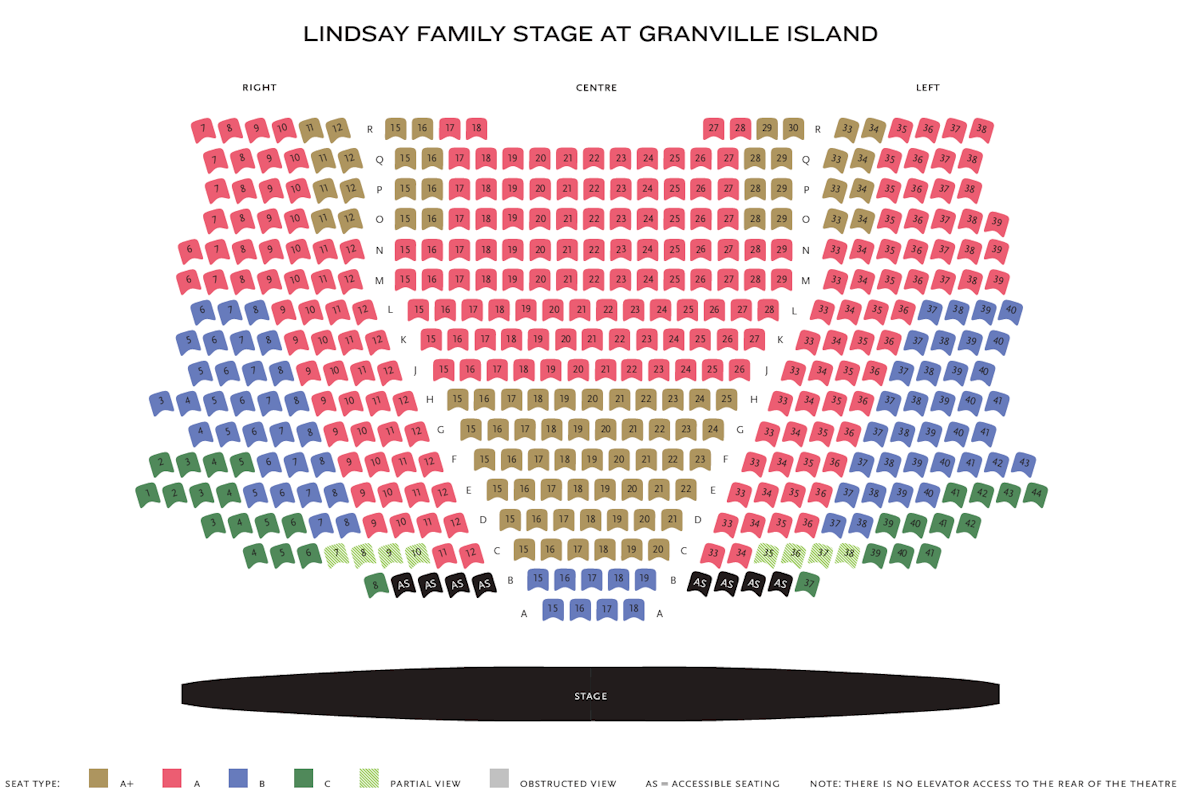 To learn more about “Partial View” and “Obstructed View” seats, check out our FAQs. For information about accessible and body positive seating, check out our Accessibility page or contact the Arts Club Box Office.